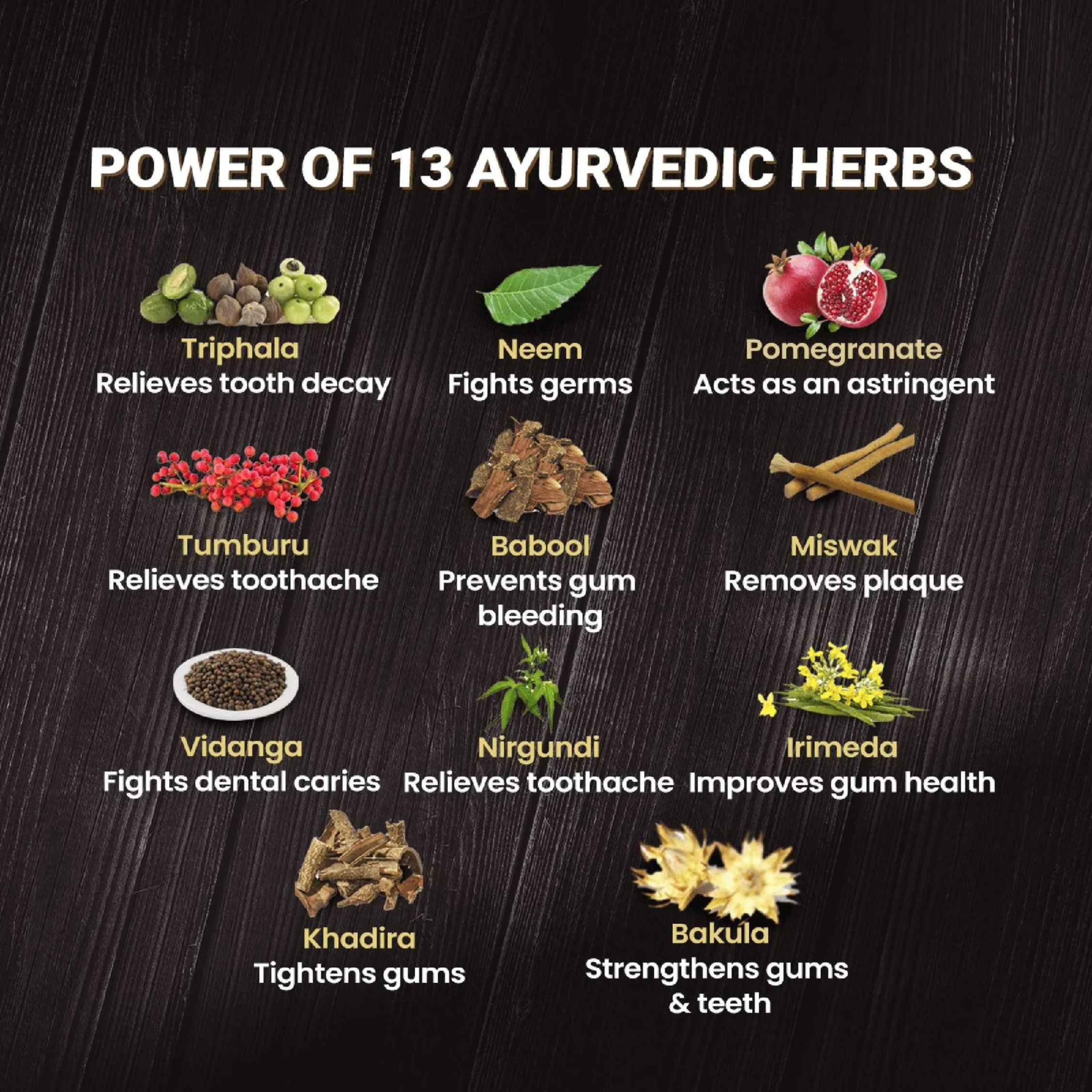 Den unika formulan innehåller hela 13 tidstestade örter som har utmärkta munvårdsfördelar och är kända för sin sammandragande, bittra och söta smak.  Formulan blandas med Vaikranta bhasma, en naturlig källa till fluor, som hjälper till att stärka tänderna.