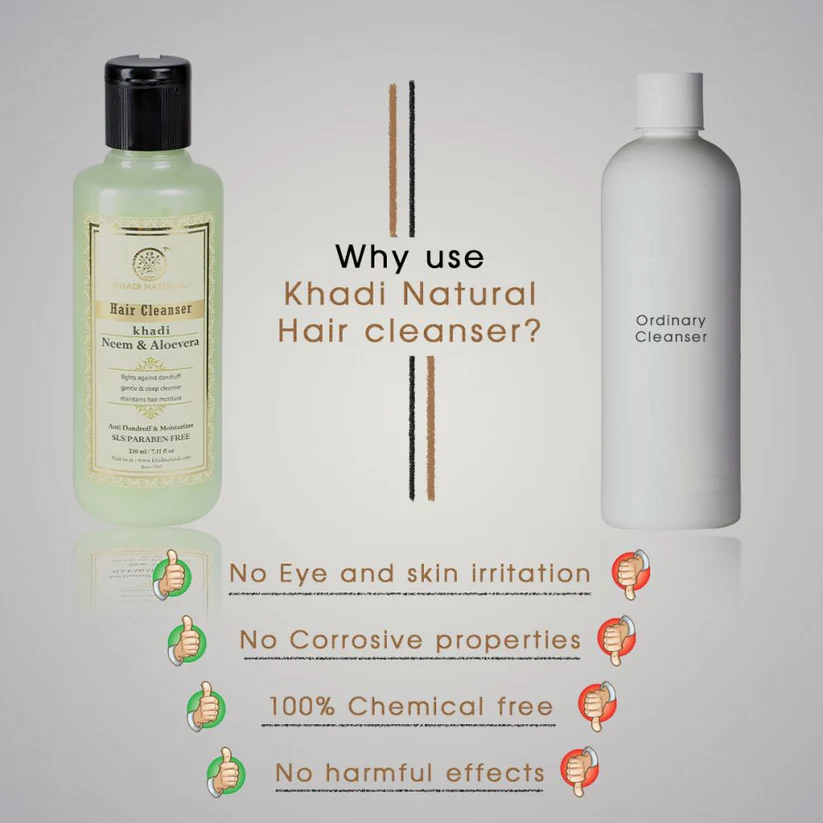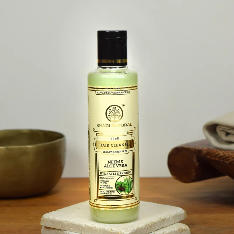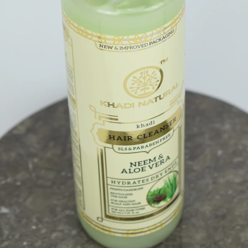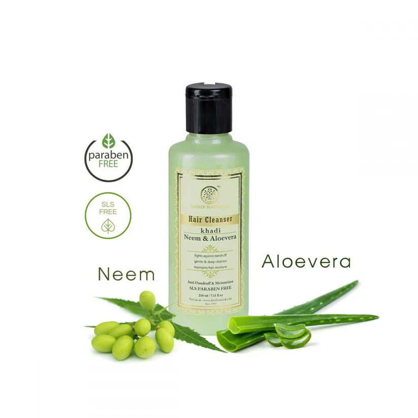 Khadi Natural Shampoo Neem & Aloevera 210 ml är ett shampoo som är speciellt framtaget för dig med problematisk hårbotten. Örtblandningen lindrar vid klåda och är mycket verksam mot mjäll. Det tvättar bort döda hudceller och lugnar hårbotten. Återuppbygger även skadat hår och förhindrar håravfall. Fritt från SLS och Parabener.