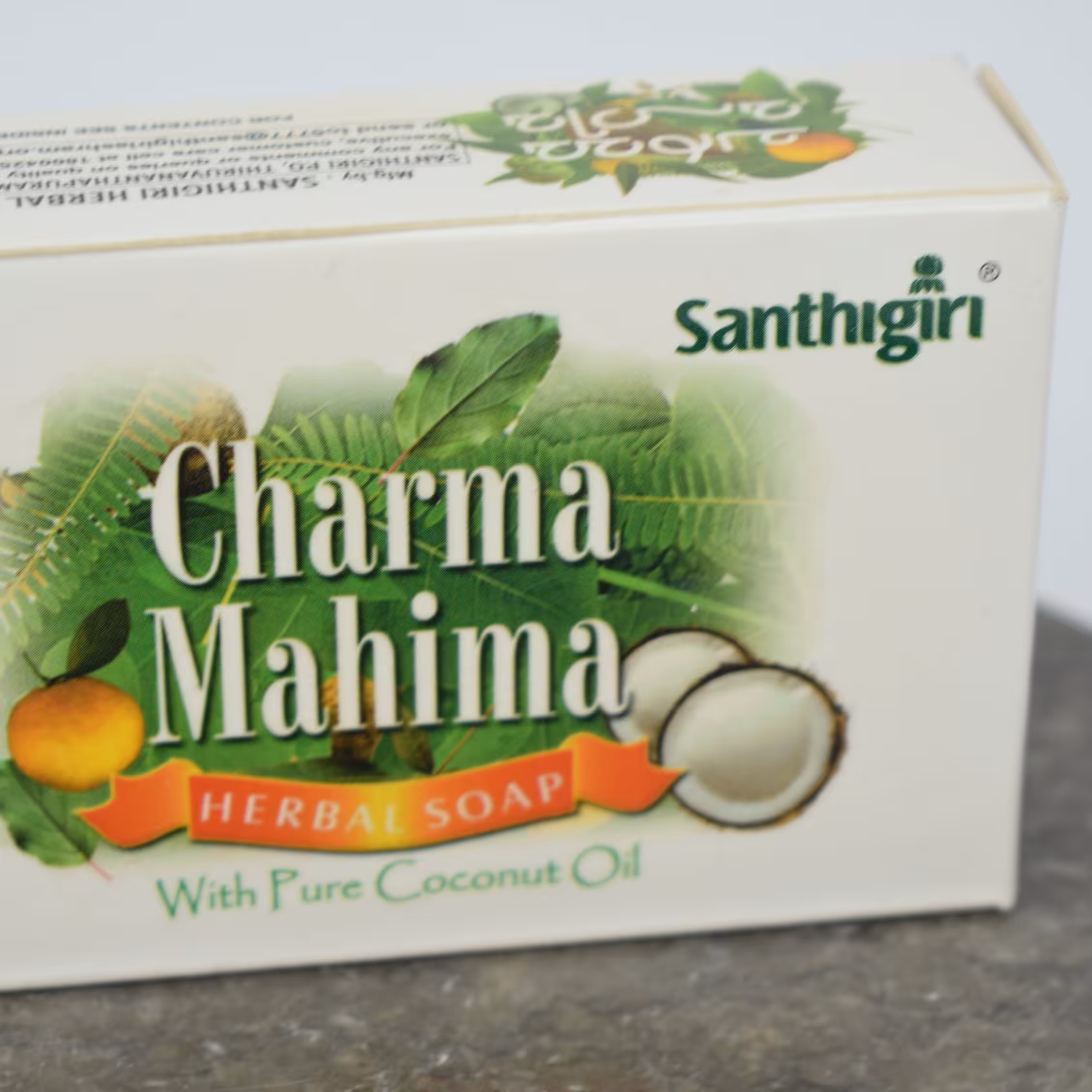 Santhigiri Charma Mahima naturlig fast tvål 75 g är en handgjord cocosoljetvål, bland annat berikad med en av ayurvedans mest tongivande läkeört Ocimum sanctum, eller Krishna Thulasi, som den heter på Sanskrit/Hindi. På svenska heter den Helig basilika, vilken också ger denna tvål sin karakteristiska friska doft.
